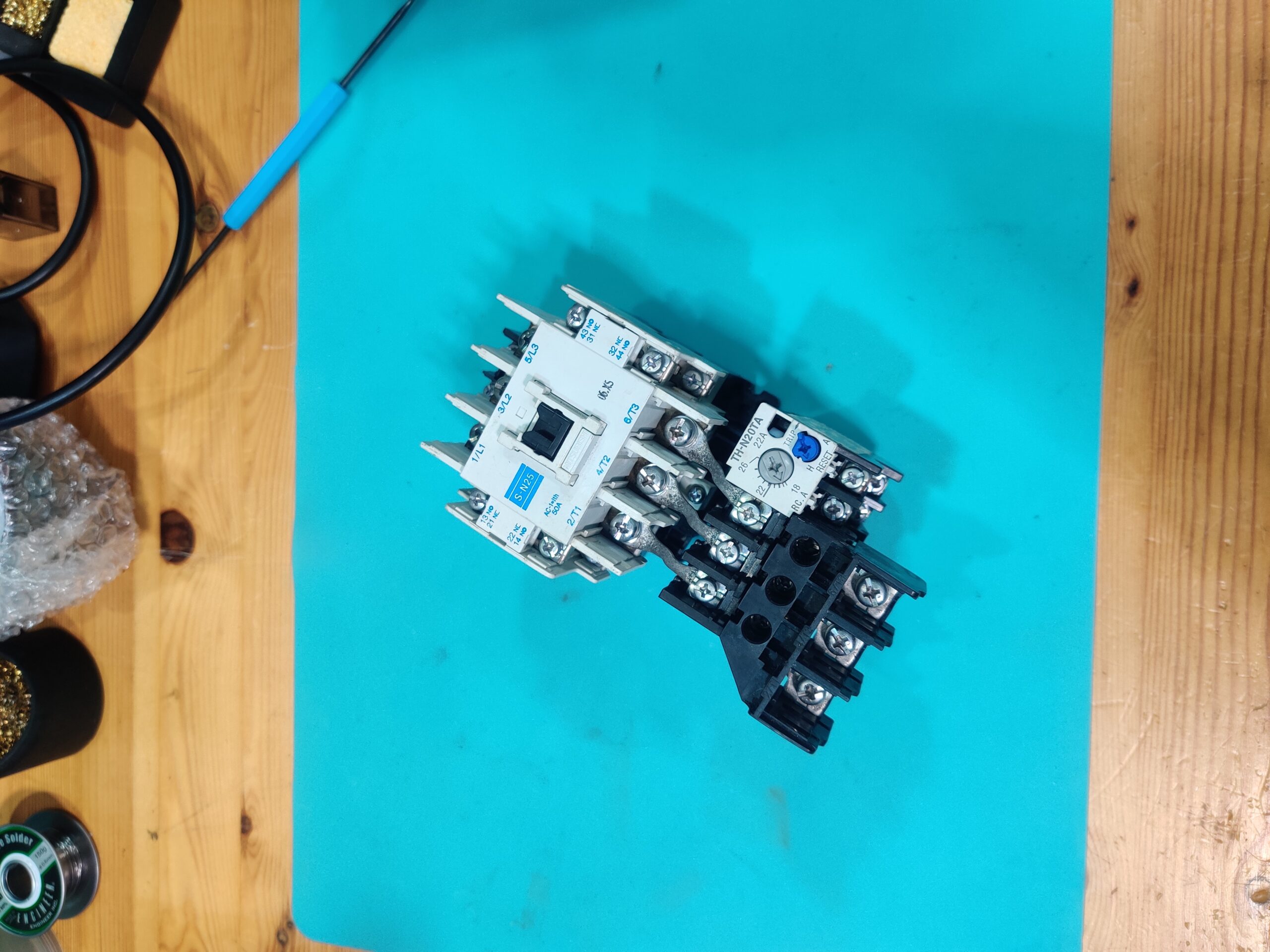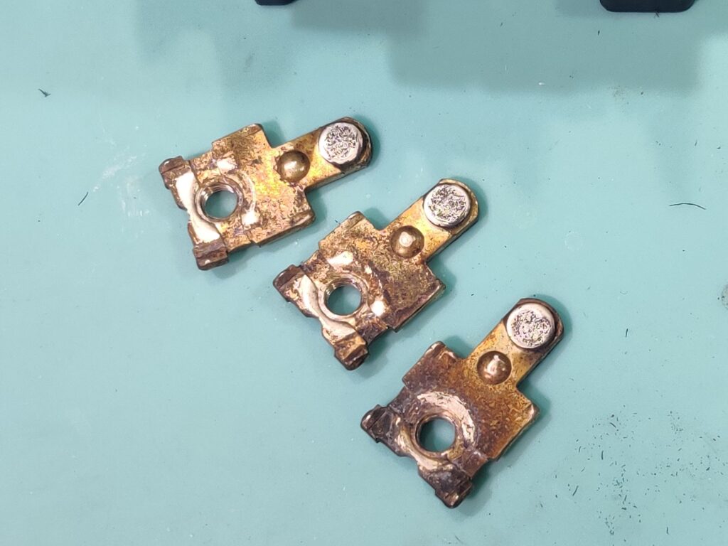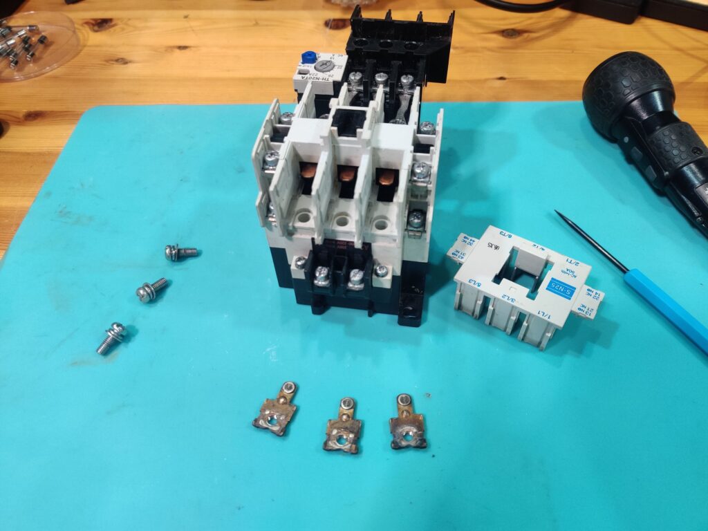 このまま持っていても仕方がないので軽くメンテして使って頂くことにしました。本当は新品に交換が良いのですが5.5kw対応品くらいになると結構な値段になります。接点を確認したとこまだまだ使えますし周辺装置にお金がかかるので今回はコレを活用いただければと思います。(もちろん中古である事の承諾は頂きます)